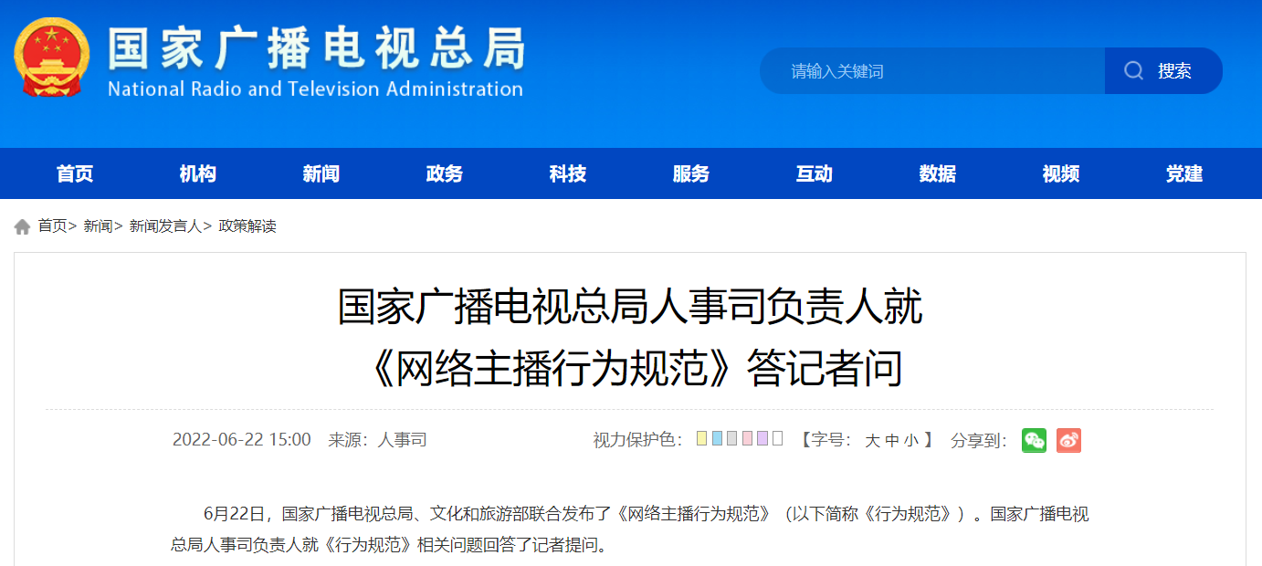 6月22日,國家廣播電視總局、文化和旅游部聯(lián)合發(fā)布了《網(wǎng)絡(luò )主播行為規范》(以下簡(jiǎn)稱(chēng)《行為規范》)。國家廣電總局人事司負責人就《行為規范》相關(guān)問(wèn)題回答了記者提問(wèn)。